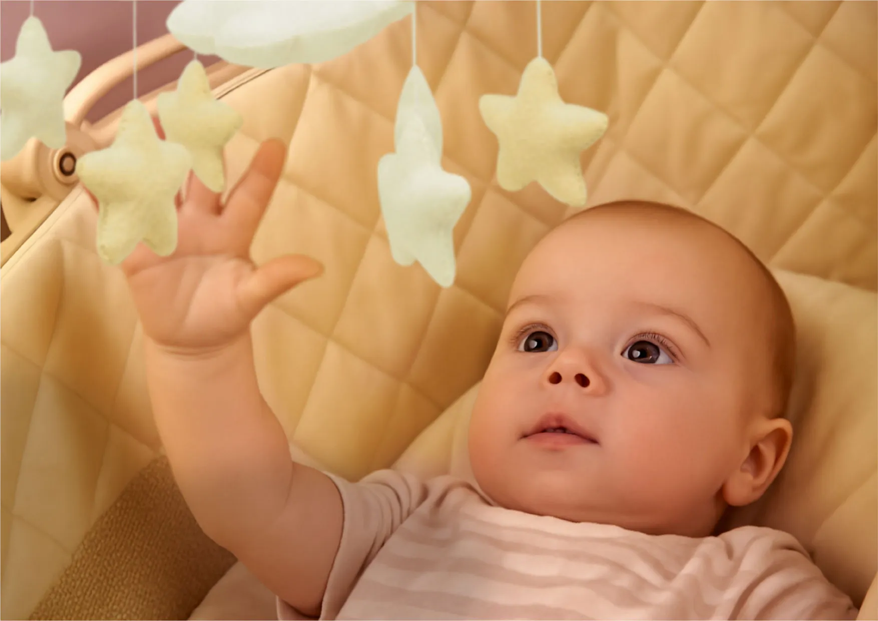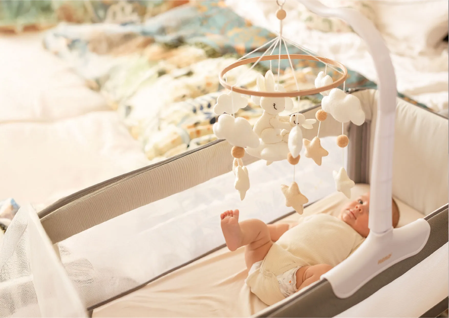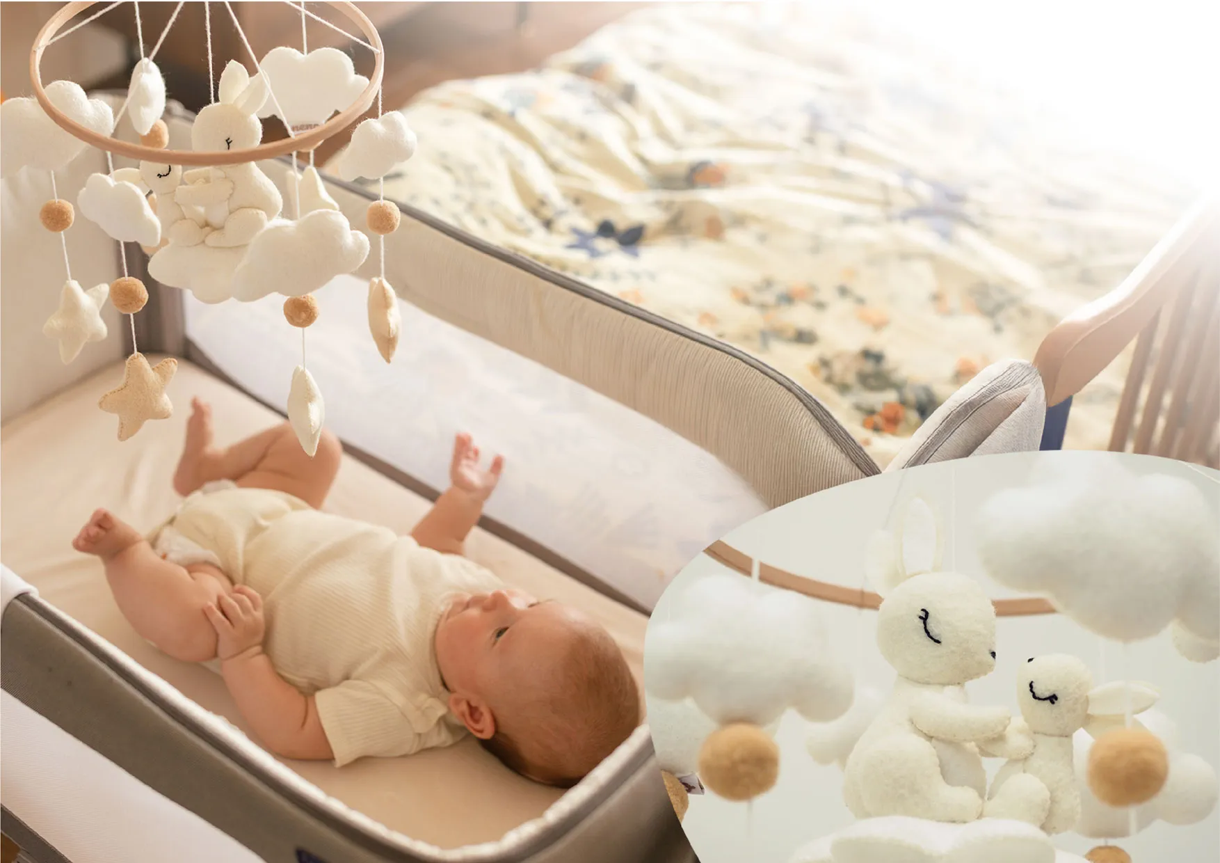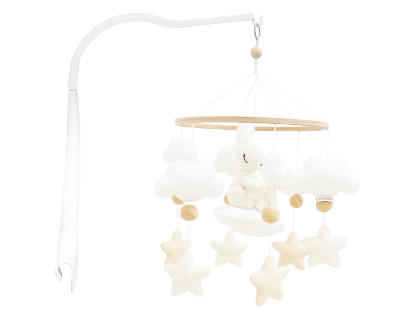 The soft hanging figures — bunnies, stars, and clouds — spark curiosity and inspire your little one to reach out and explore. These small, joyful gestures support early motor development and help your baby discover the world through play.