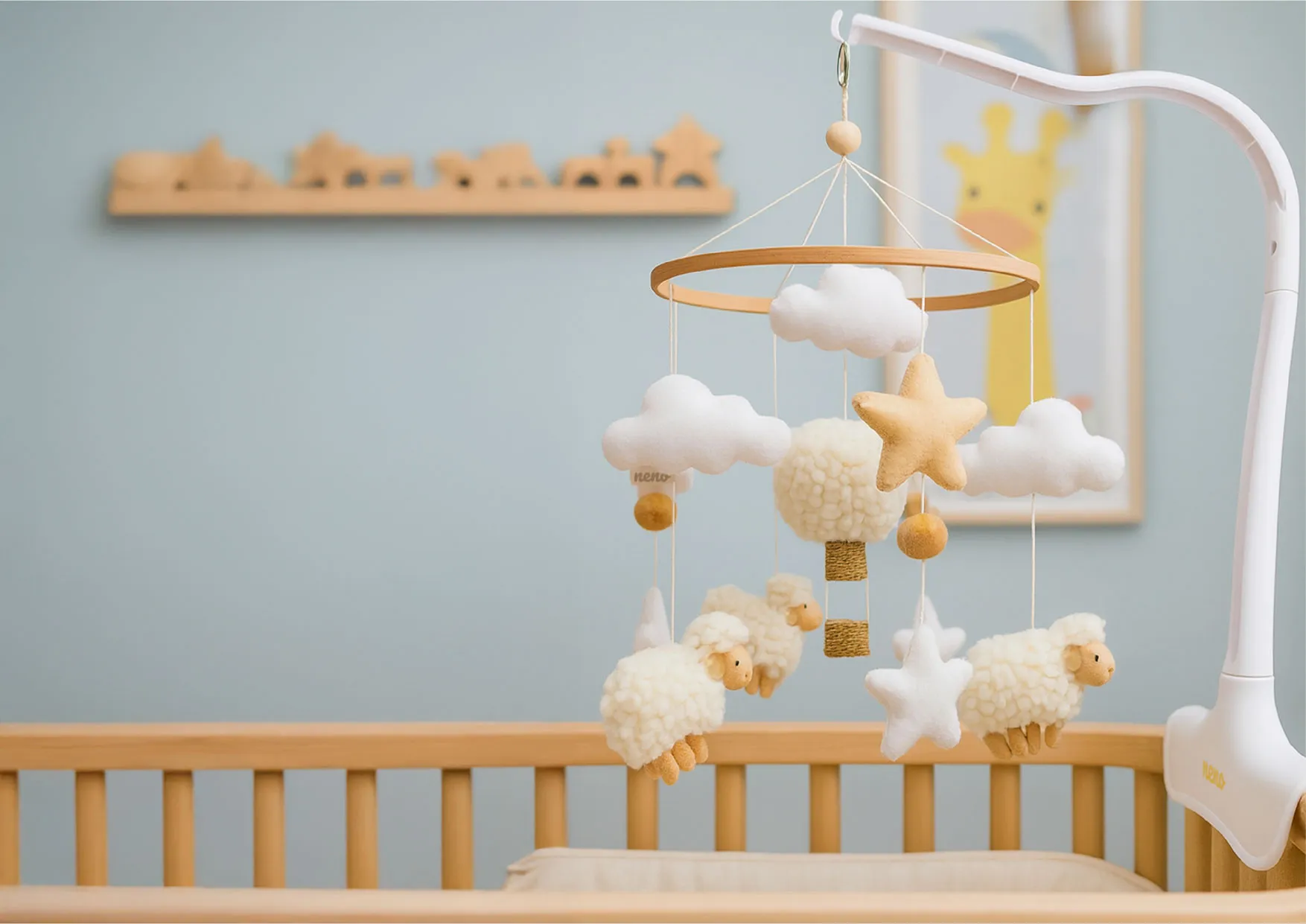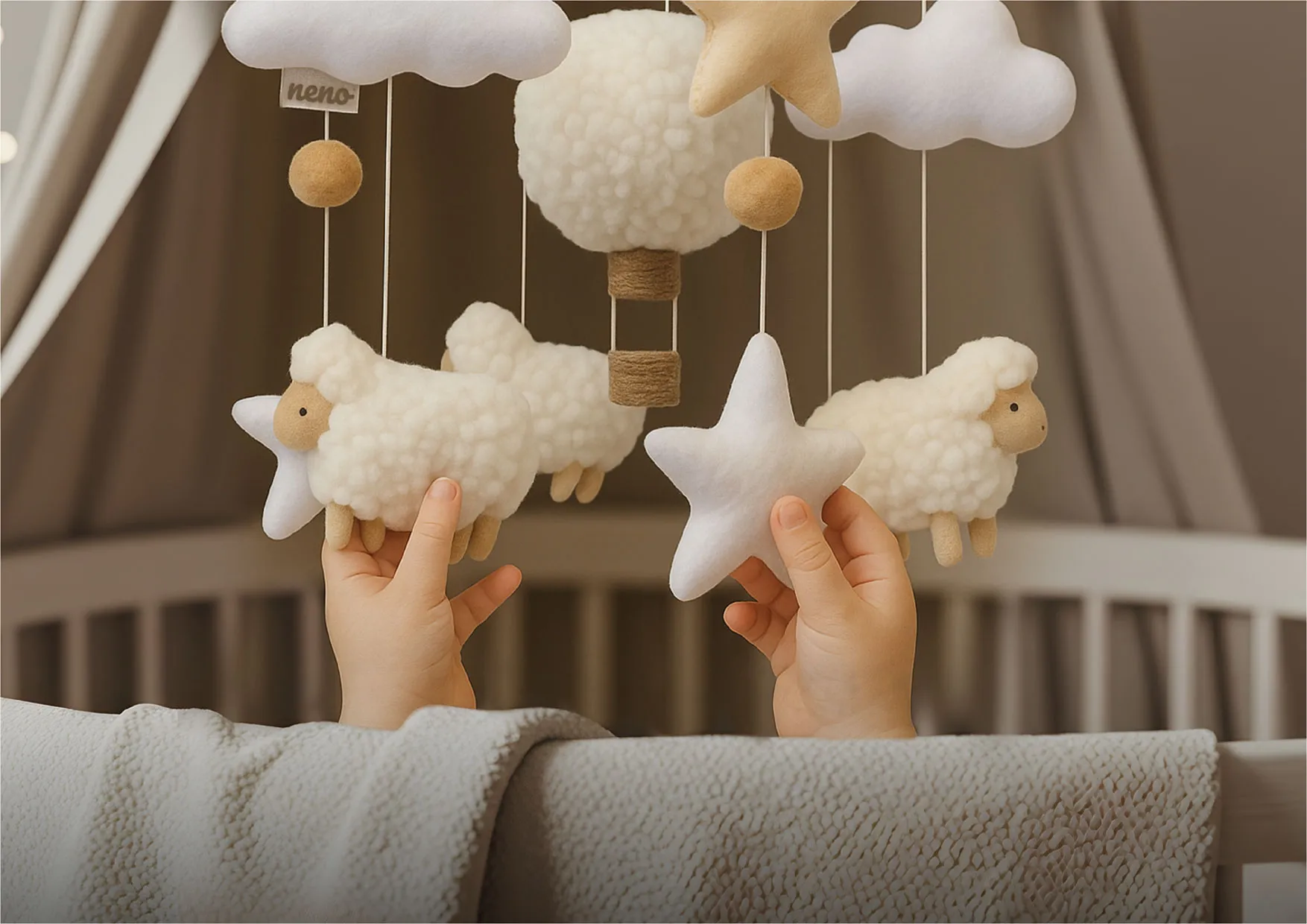 Setting up the Neno Nelu mobile couldn’t be simpler — no screws, no tools, no hassle. In just a few easy steps, it’s ready to use. The set includes a sturdy mounting arm that securely attaches to most standard cribs, ensuring stability and ease of use. Practical, safe, and beautifully designed.