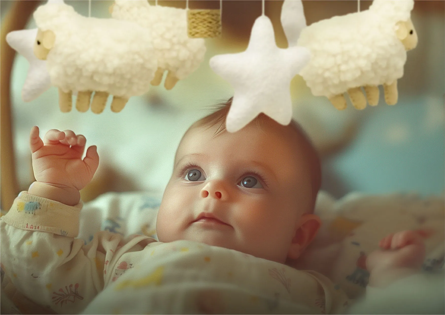 The softly moving figures — lambs, clouds, and a balloon — encourage your baby to focus and follow movement with their eyes. It’s a gentle and natural way to stimulate visual perception and early cognitive skills.