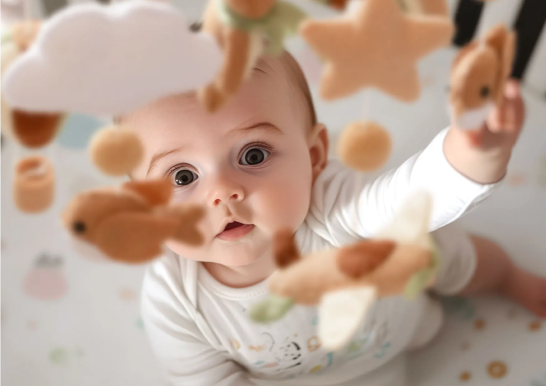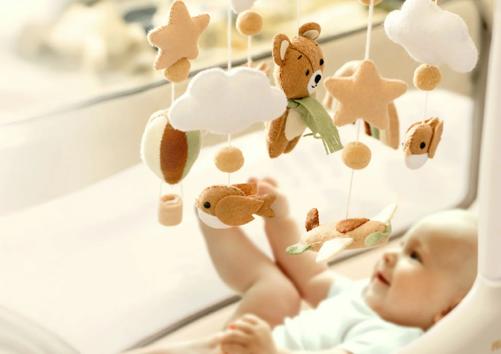 The gently moving plush figures catch your baby’s eye and encourage visual tracking. This natural form of play helps develop your little one’s ability to follow motion and distinguish shapes and colors from the very first months of life.
